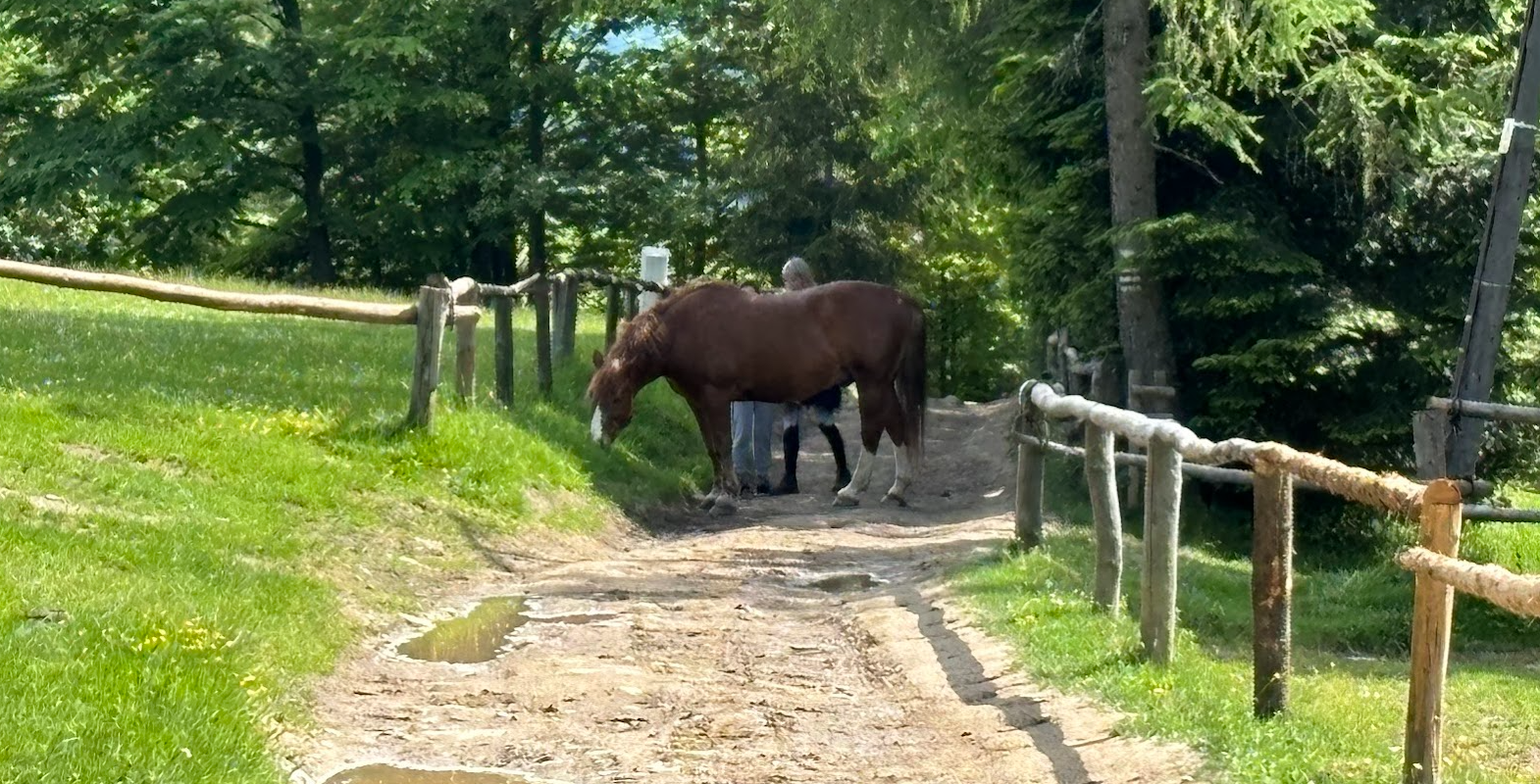 Wędrując długim grzbietem Abrahamowa (jedno z ramion Romanki), nie mogliśmy się doczekać wizyty w stacji turystycznej "Abrahamów". Popołudnie w Beskidzie Żywieckim zrobiło się słoneczne, nawet ciepłe. Zimne piwo (Pinta oczywiście!) i możliwość zdjęcia butów i skarpetek dodawały skrzydeł. W gratisie mieliśmy jeszcze piękny widok z końmi.