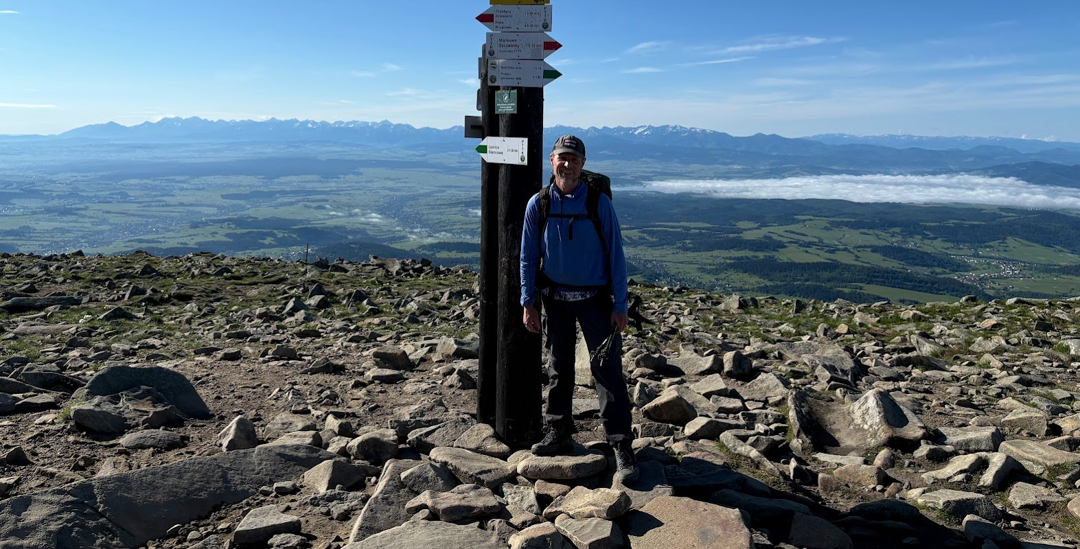 Popatrzmy na to, co nam zaprezentowała. Na zdjęciach oznaczam szczyty Korony Gór Polski w Karpatach. W Beskidach jest ich 9 (licząc łącznie z Babią Górą, na której jesteśmy). Do tego dochodzą Pieniny i Tatry. Zgadnijcie ile karpackich szczytów KGP widzieliśmy? Zwiedzanie zaczęliśmy jeszcze poniżej szczytu, powyżej granicy piętra subalpejskiego (czyli kosodrzewiny).
