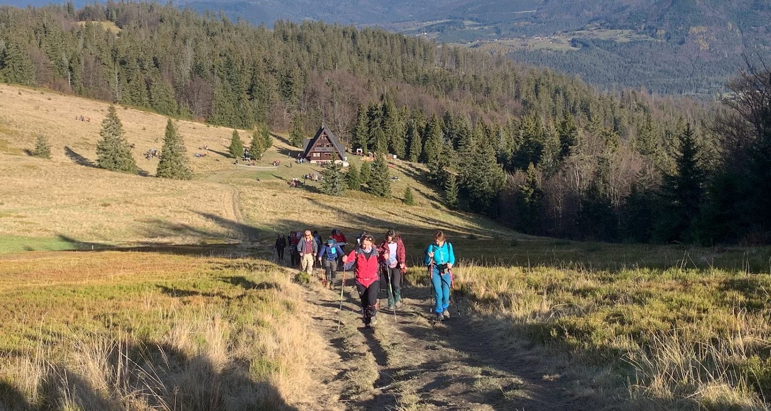 Od Bacówki idziemy na szczyt Wielkiej Rycerzowej (1226m n.p.m.), a stamtąd czerwonym, granicznym szlakiem w kierunku przełęczy Przegibek. Ta część trasy prowadzi przez las. Co pewien czas pojawiają się widokowe przecinki - głównie na stronę słowacką.