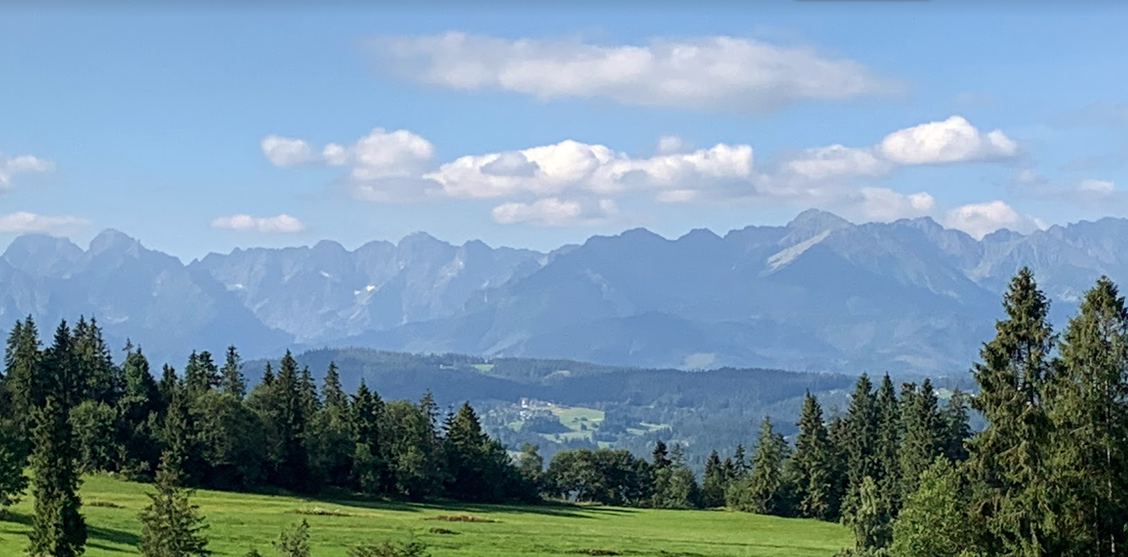 Krótki odcinek od mostu przez Trybsz prowadzi drogą. Potem niebieski szlak Brzeźnica - Kacwin wije się przez łąki, pola i lasy Spiszu. Piękna pogoda pozwala na podziwianie panoram. Na zachód, przez płaskie z pozoru Podhale, patrzymy na Babią Górę. Na południu mamy Tatry, a na północnym wschodzie Pieniny. Oglądając się za siebie, na północ, widzimy Gorce. jest cudnie.