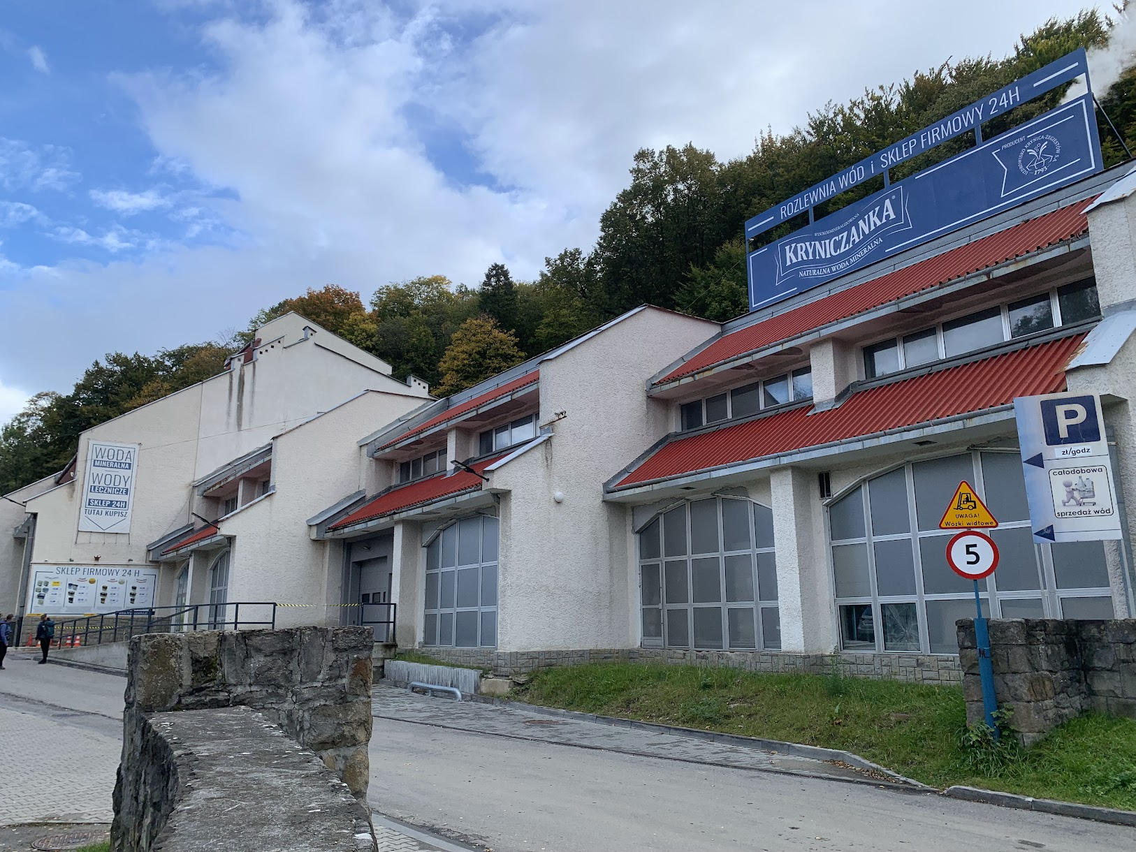 Szlak rozpoczynamy na południowym końcu krynickiego deptaka - dokładnie tam, gdzie skończyliśmy poprzedniego dnia. Pierwszym przystankiem jest... sklep firmowy Kryniczanki. Chcemy zaopatrzyć się w wodę. Ale sklep sprzedaje hurtowo, zgrzewka to minimum.
