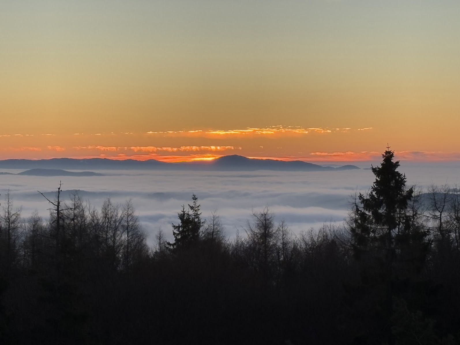 Wypatrując kuli słońca wychodzącej znad Minčola, podziwialiśmy mgły snujące się w dolinach. Na zdjęciu poniżej widać wyłaniający z nich Busov - najwyższy Beskidu Niskiego (najdalszy plan, lekko na lewo od środka).