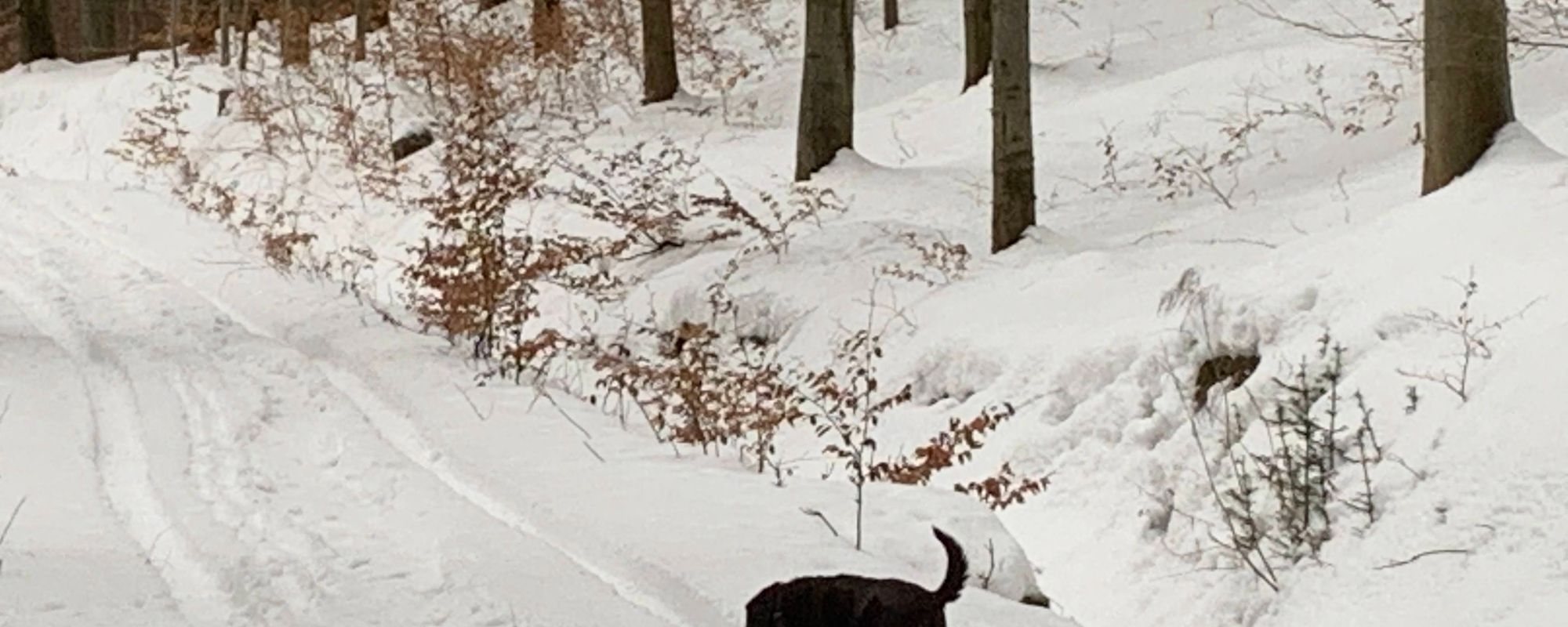 [POL] Tuż zejściu z wiejskiej drogi na szlak, dołączył do nas miejscowy pies. Zadbany, z obrożą, ale bez właściciela. Szedł przed nami, obwąchiwał śnieg, znaczył nasz żółty szlak dodatkowymi żółtymi znakami :-) Psy wiejskie tak mają, zwykle nie chodzą na smyczy. Ale w pobliżu nie było właściciela.