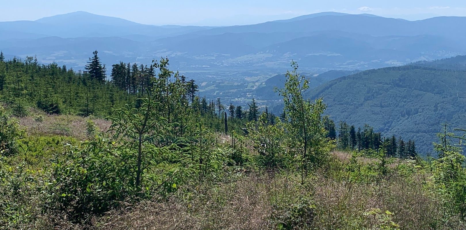 Od tego miejsca szlak w kierunku Skrzycznego jest spacerowy. Na dystansie 4,5km pokonujemy zaledwie 100m różnicy wysokości. Trasa jest odsłonięta i bardzo widokowa. Po prawej stronie przesuwa się opisany powyżej krajobraz. Zza Pilska, przy dobrej widoczności, pokażą się Tatry. Gdy będziemy oglądać się za siebie, zobaczymy Worek Raczański a za nim słowacką Małą Fatrę z charakterystycznym Wielkim Rozsutcem i Krivaniem. Natomiast po lewej widzimy Beskid Śląski i pasmo Czantorii i Stożka oraz grzbiet odchodzący od przełęczy Salmopolskiej, zakończony Równicą. Za nimi widać czeskie Beskidy Śląsko-Morawskie.